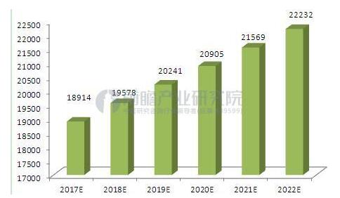 圖表1:2017-2022年中國海綿城市建設市場規模走勢預測(單位:億元)